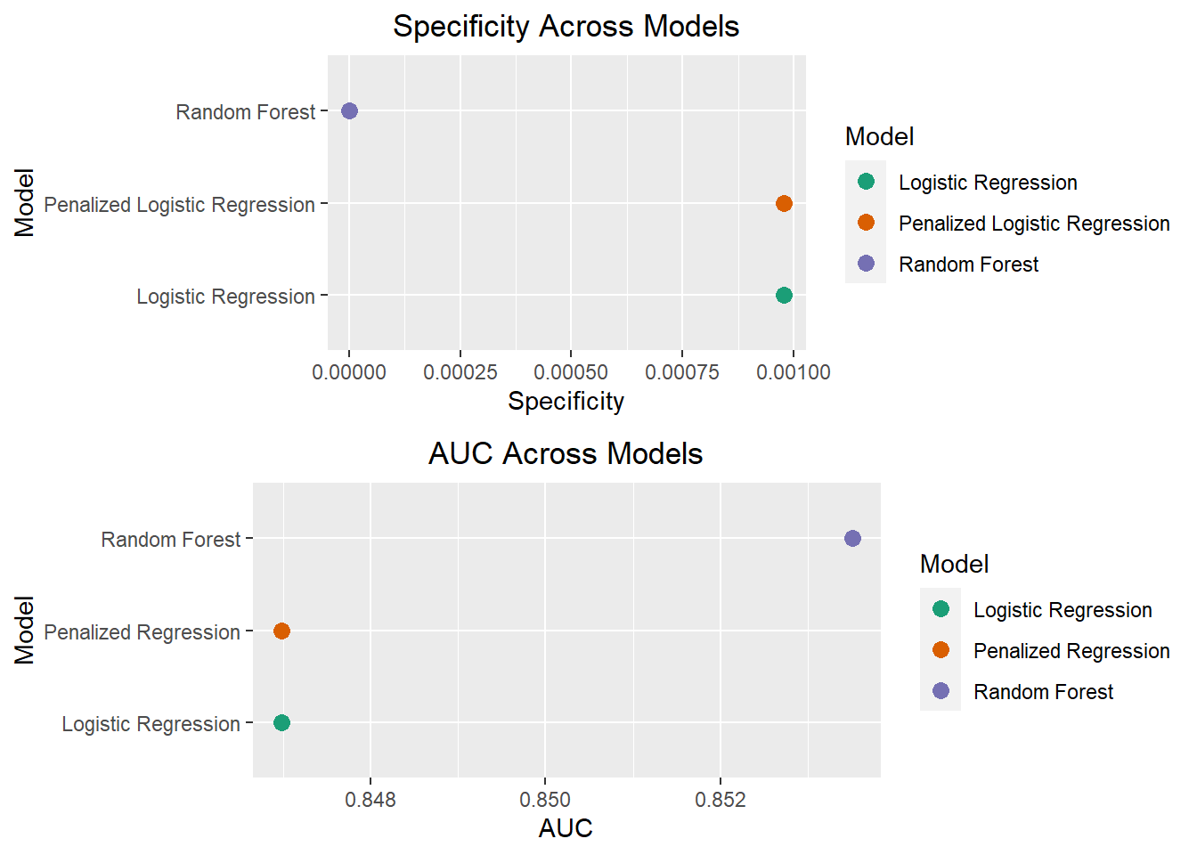 For this data set I am going to be comparing 3 different models, logistic regression, penalized logistic regression, and random forest. All 3 models can handle this binary classification problem but have various pros and cons associated with them.