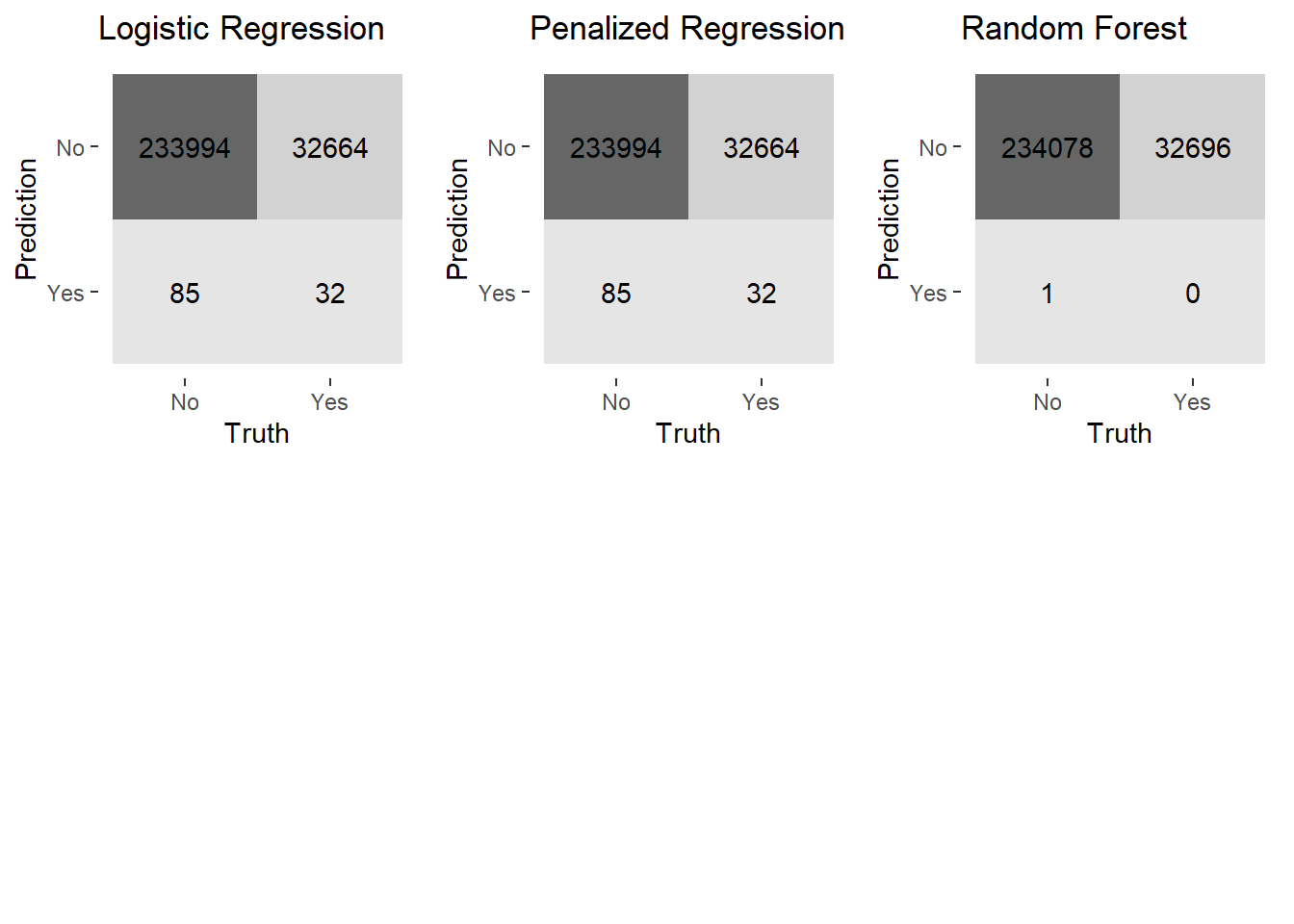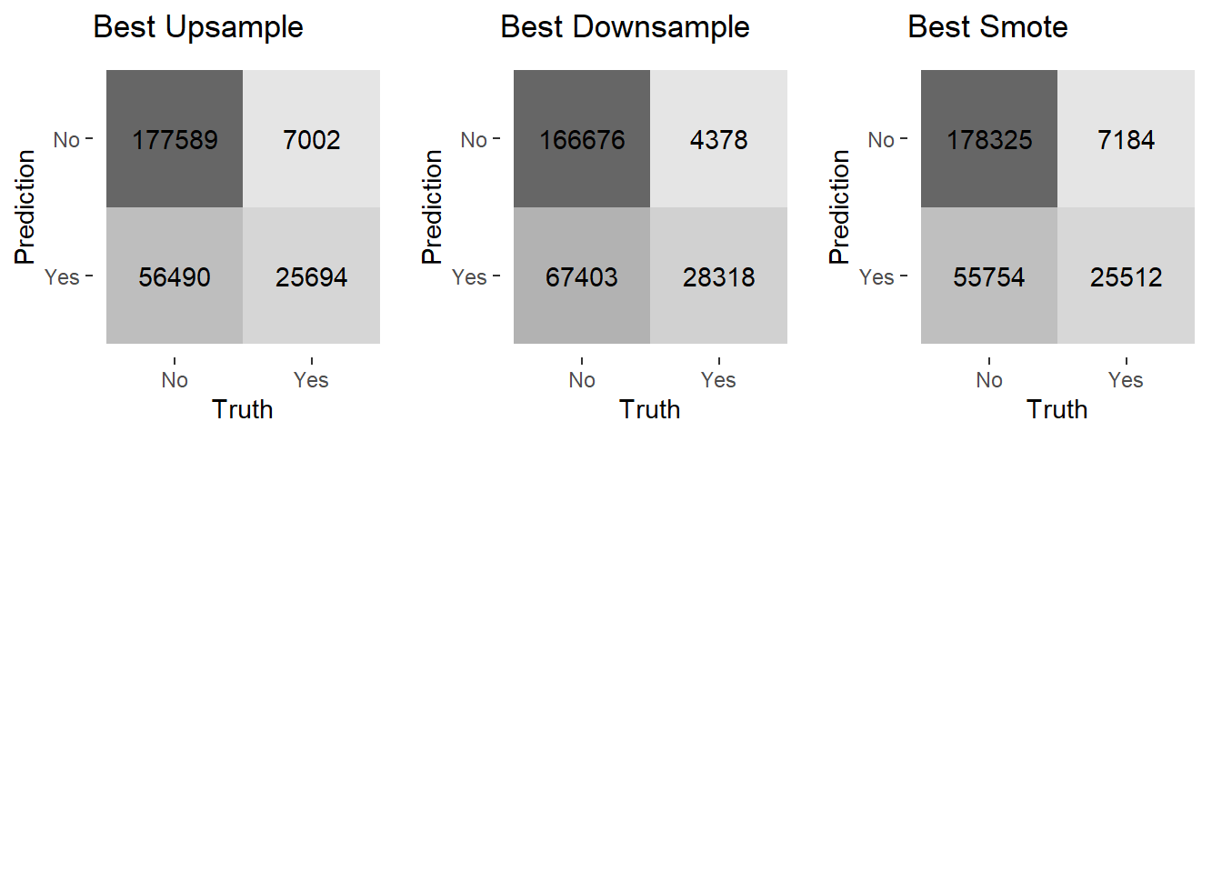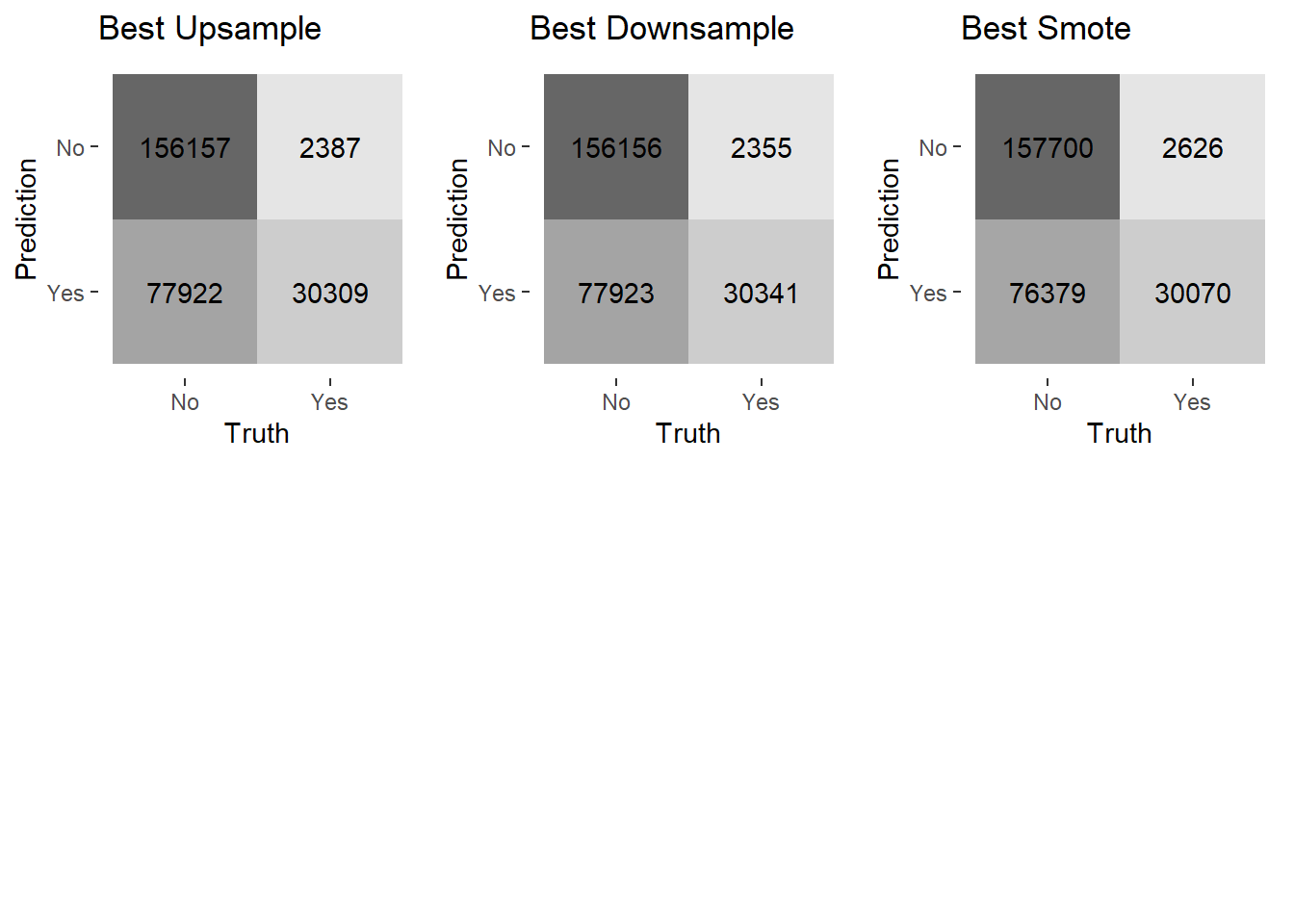 grid.arrange(cm_upsamp,cm_downsamp,cm_smote,ncol=3,heights=c(1,1))