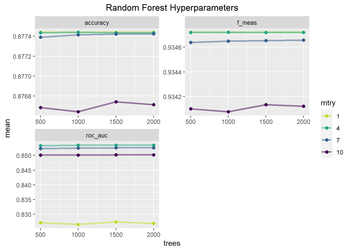 The optimal threshold for every model results in very similar performance. This is not surprising considering the ROC curves were overlapping. In relation to the previous confusion matrix on the training data, the models have a better rate of true negatives, more false positives, and fewer false negatives. This clearly is not the best model, but it offers a significant improvement over the initial efforts and can serve as a starting point in modelling efforts.