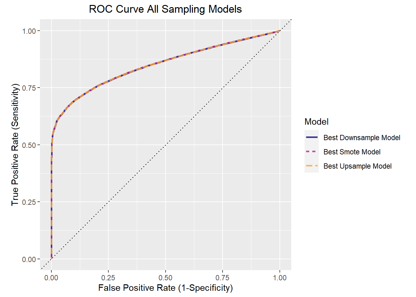 This ROC curve displays the tradeoff of the true positive rate (sensitivity) to the false positive rate (1-specificity). The three sampling techniques offer incredibly similar performance as can be seen with the lines overlapping.