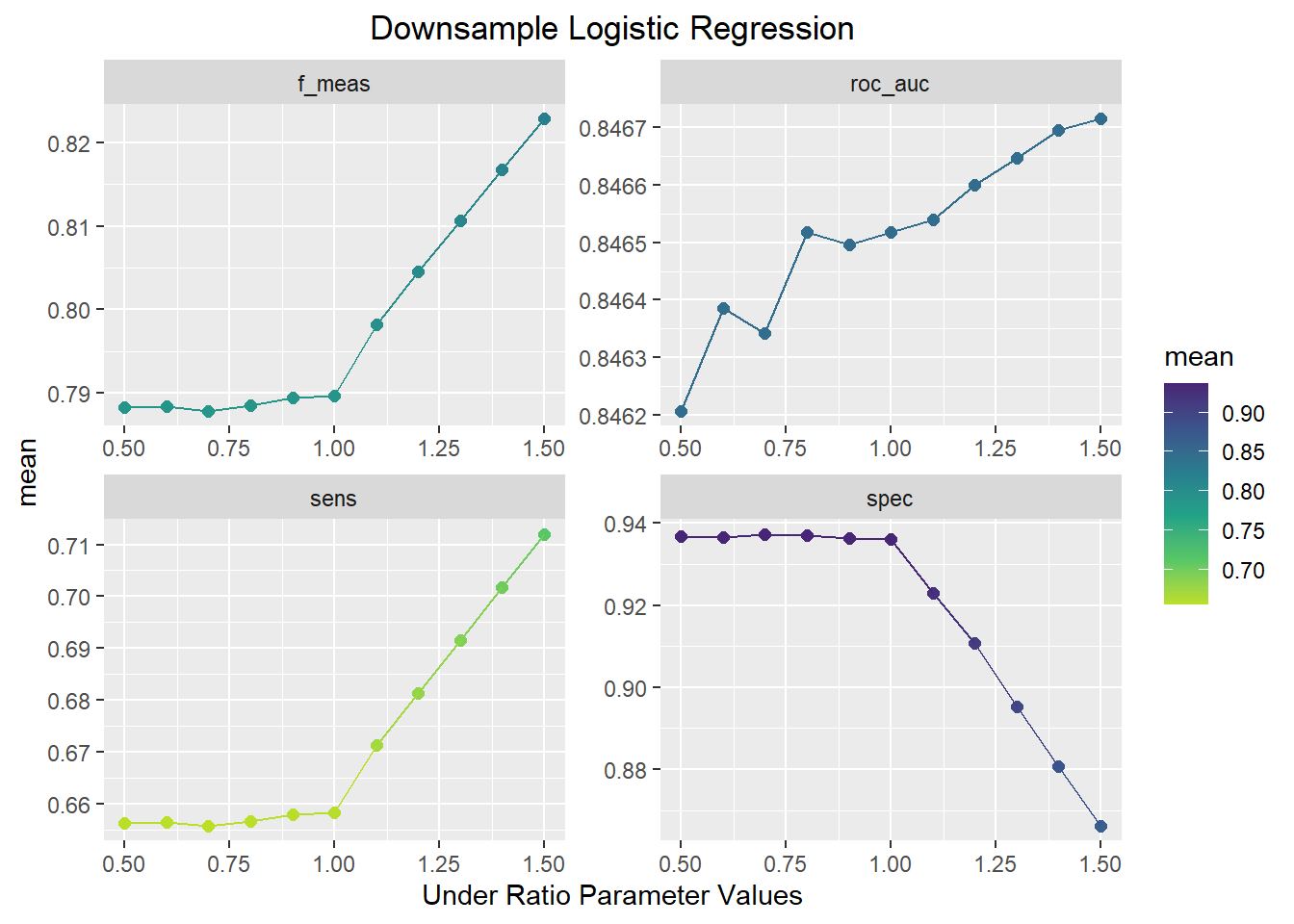 This plot shows the opposite pattern as the upsample model. In this plot, F1-score, AUC, and sensitivity increase and the specificity decreases as the under_ratio parameter increases. An under_ratio value of 1.5 seems to offer the best model performance.