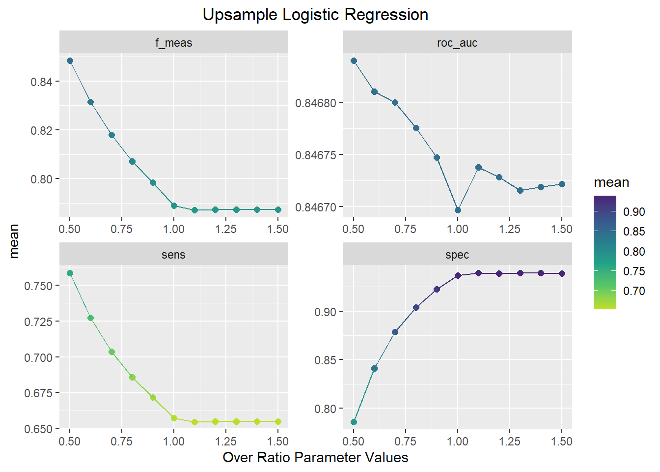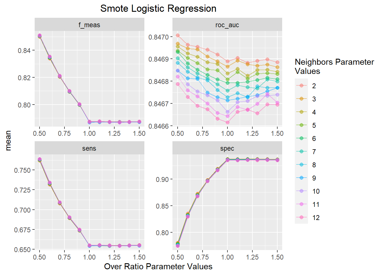 This plot shows a similar trend as the upsample model with sensitivity, AUC, and F1-score decreasing and specificity increasing as a function of increasing over_ratio values. The value of neighbors has a minimal effect on model performance with 2 neighbors offering the best AUC value across all over_ratio parameter values.