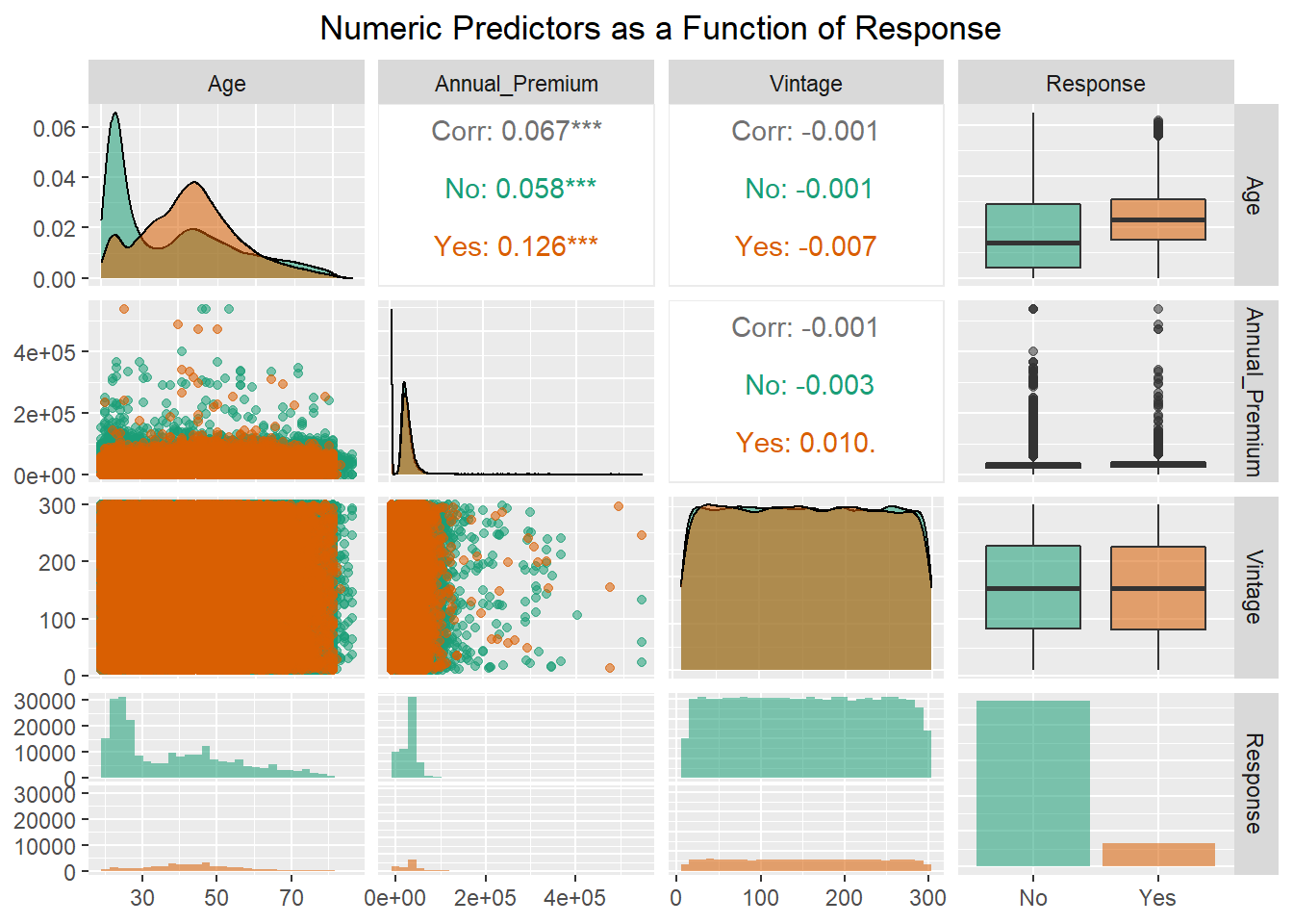 This plot shows that age has a skewed bimodal distribution for “No” respondents with the majority of individuals being around 25 years of age, and another concentration of individuals around 40 years of age. For “Yes” respondents, the distribution is less bimodal with the majority of responses centered around customers who are 40 years old. Examining the boxplot of Age shows that the median age of customers responding yes is older than those who responded no. The annual premium is also skewed with individuals who responded yes and no seemingly having a similar distribution of premiums. As was seen in the summary there is a maximum annual premium of 540,165, which is far above the median value of 31,662. The number of days with the company is an almost uniformly distributed predictor with no difference between “Yes” and “No” customers. The correlations among the predictors shows that there is little to no relationship among these numeric predictors indicating the absence of multicolinearity. This is important to keep in mind as the response variable is binary and thus logistic regression is a prime model of interest and one of the model assumptions is that there is no multicolinearity.